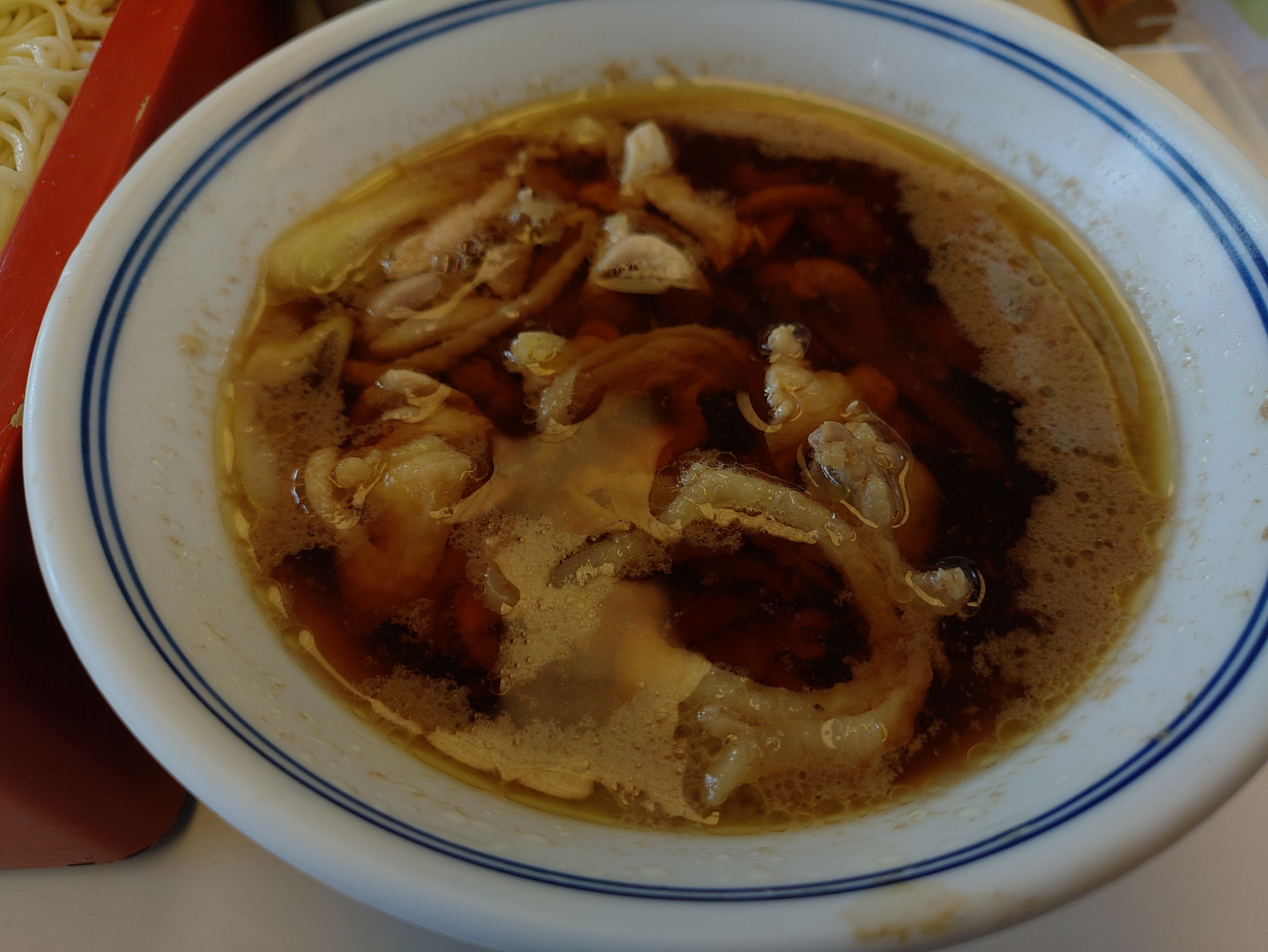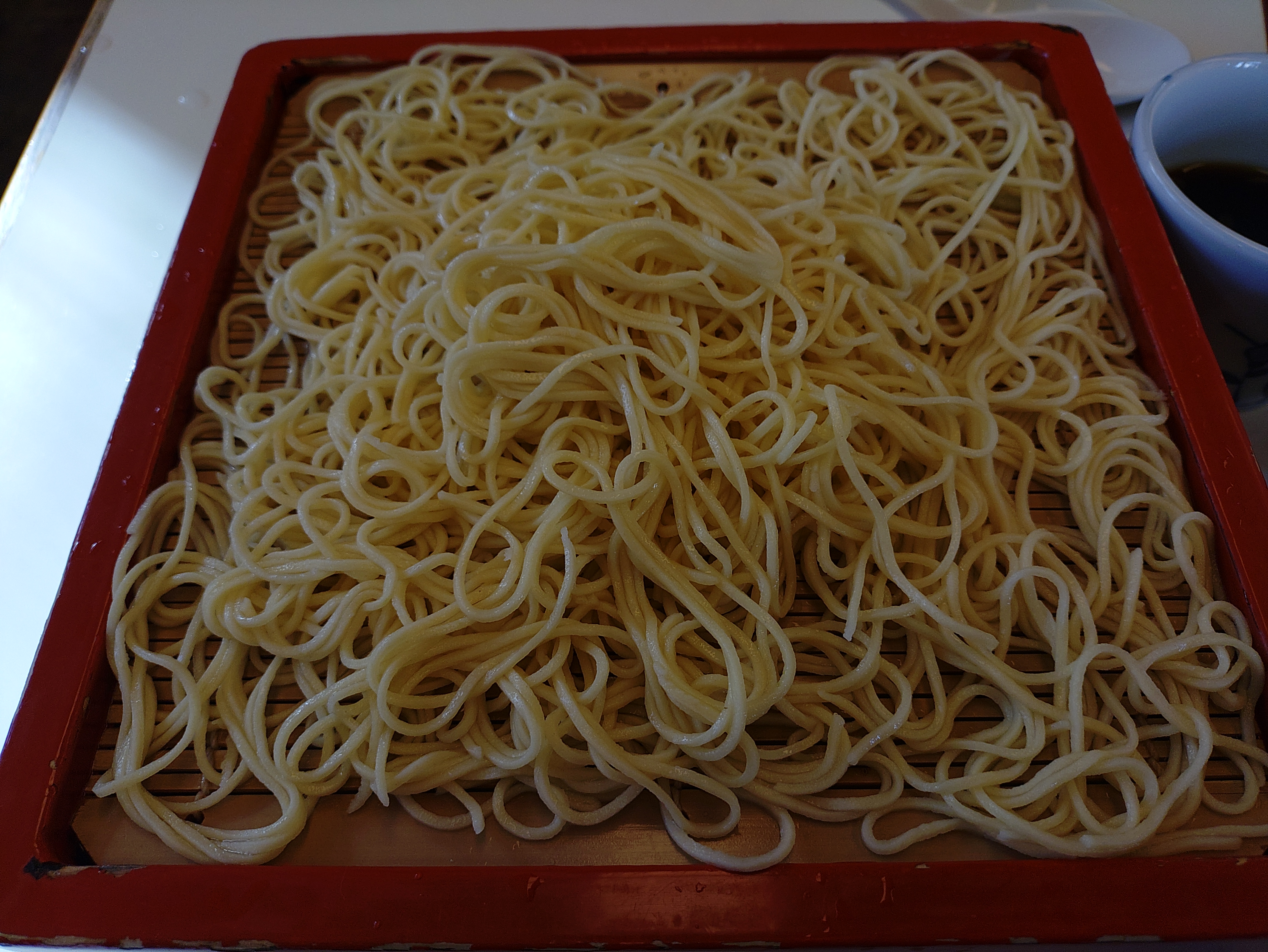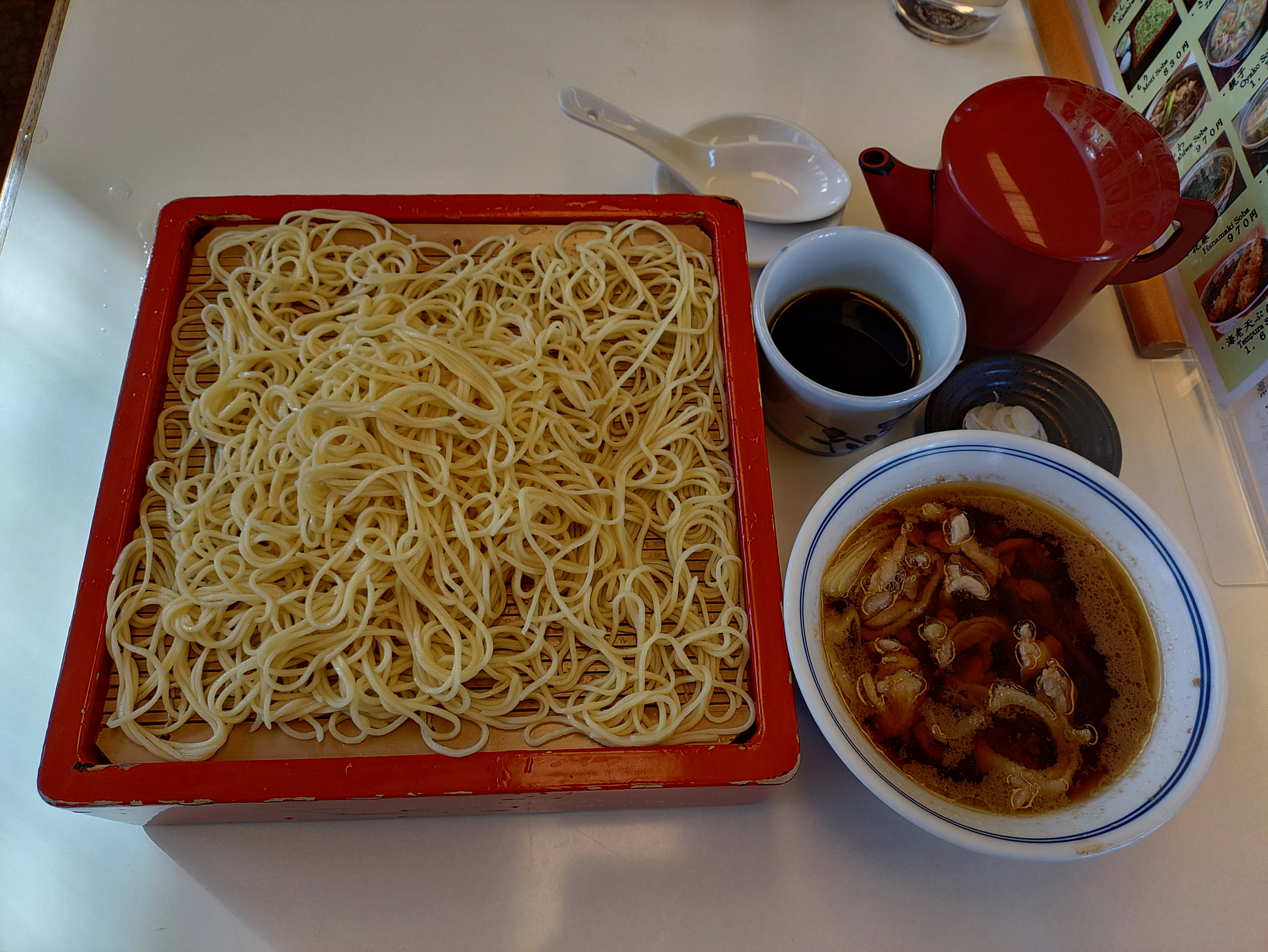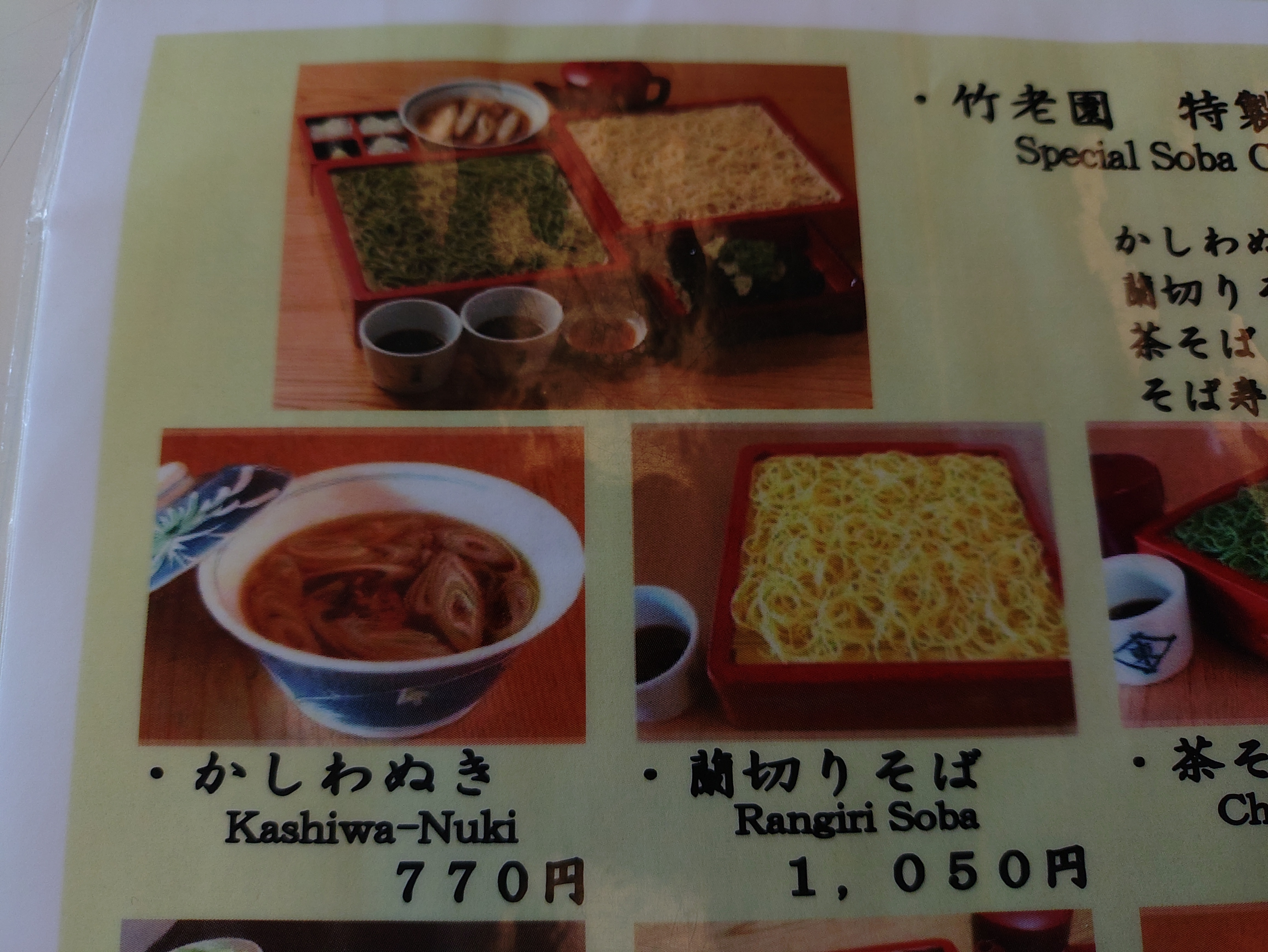 コメント:そば店。当地方は全国一のそば産地で寒冷な気候がそばの栽培に適しているということなのであろう。当店は天皇陛下がそばのおかわりをされたことで有名であるがつなぎに卵黄を使った蘭切りそばとかしわ抜きを試してみた。蘭切りそばはなるほどつなぎに卵黄を使っているのがすぐわかったが、平素食べているそばとは全く別物であった。そばの風味はあり確かにそばなのであるが卵黄のまろやかさが麺を全く別物に仕上げている。もちろんラーメンでもうどんでもないし、独特の麺としか表現しようがない。なるほど陛下がおかわりをされる理由がよくわかった。かしわ抜きとはかしわそばから麺を抜いたもの、当店では「スープ」としているがこの一品も江戸時代から見かけられるものでいわばそばやのオードブルである