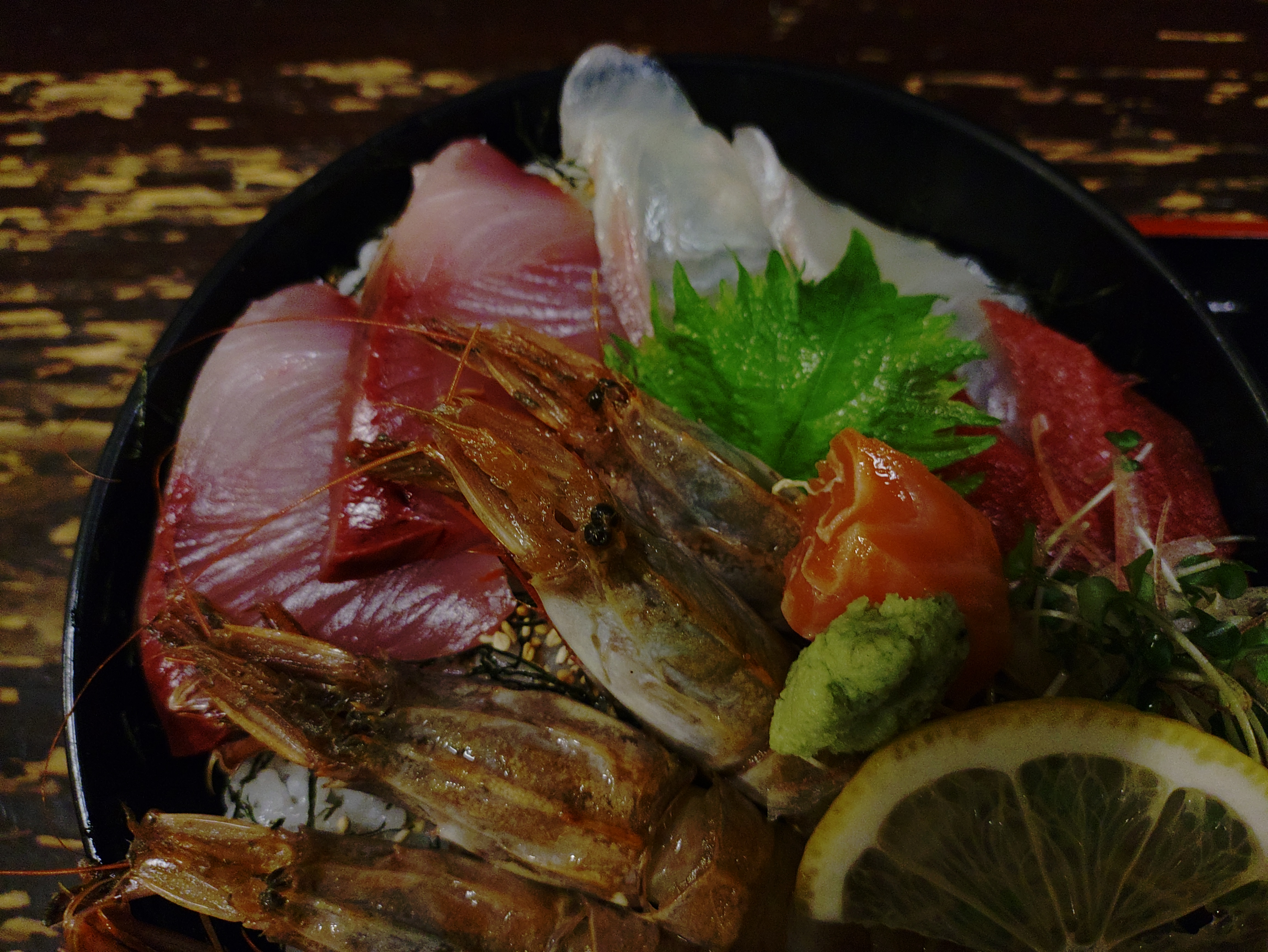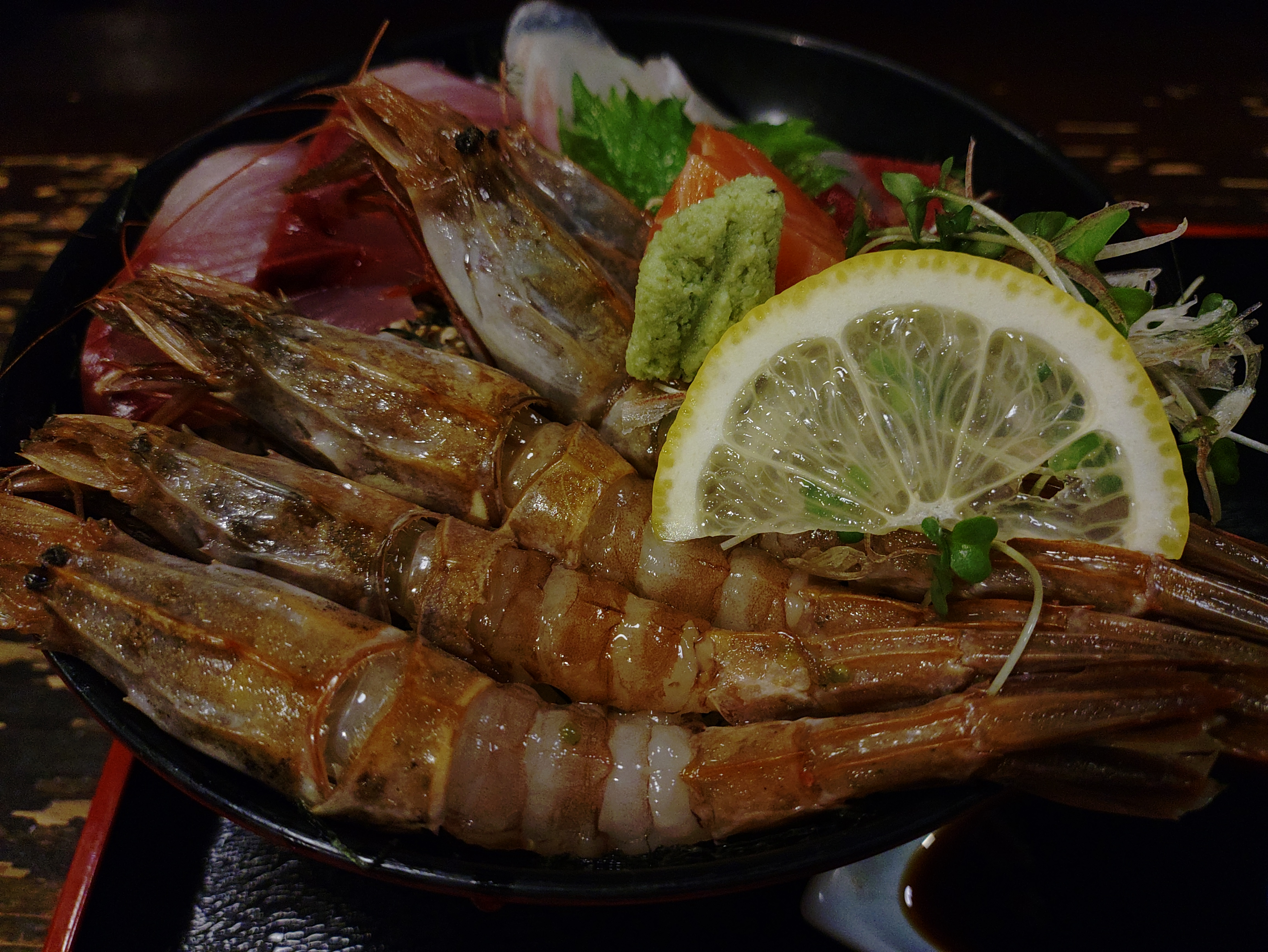 コメント:玉子とじ甘エビ天丼。ガサエビ丼と共に